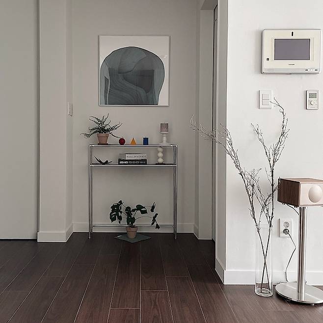 안방과 주방 사이 빈 벽은 미드센추리존이라고 이름을 붙였어요. 좋아하는 그림을 먼저 설치했는데 아래 공간이 허전해서 모듈 콘솔을 두었어요. 모던한 분위기가 마음에 들어요.