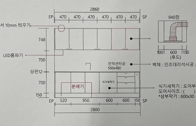 후드 또한 히든 후드를 선택하였는데 규격 사이즈가 있어서 상부장의 폭이 달라질 수밖에 없다고 하더라고요. 디자이너의 직업병인지 저 폭은 꼭 맞추고 싶었어요.