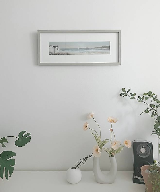 늘 기분 좋게 출근 준비를 할 수 있도록 따뜻한 풍경의 작은 액자를 걸어두고 아래로는 좋아하는 소품을 배치하여 아늑한 분위기를 연출하고 있어요.