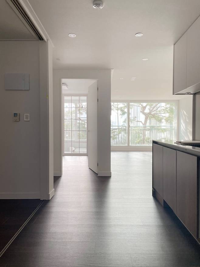 실내에서 바라본 전실의 풍경이에요. 중문은 따로 설치하지 않았어요. 계단식 아파트라 중문의 필요성을 못 느끼기도 했고 전실 창으로 보이는 풍경을 실내에서도 보고싶었기 때문이에요. 공사 중에는 앙상한 나뭇가지였는데 지금은 초록 잎이 무성하게 자랐네요. 계절의 변화를 오롯이 느낄 수 있는 이 공간이 저는 정말 좋아요.