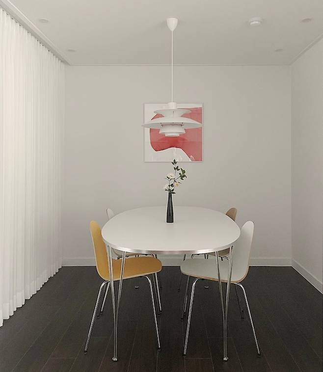 의자는 간결한 디자인을 선택했어요. 별다른 디테일은 없지만, 오히려 그 점이 오래 보아도 싫증 나지 않고 어느 공간이든 조화롭게 어우러지리라 생각했어요. 노란색으로 포인트를 주었는데 잘 어울리는 것 같아요.
