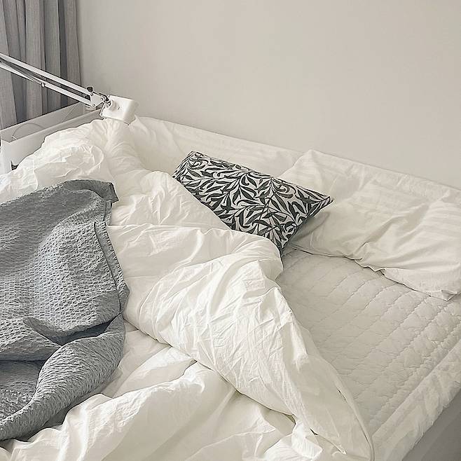 사각사각 촉감이 좋은 화이트 침구는 항상 깔끔하게 유지하려 노력하고 있어요.