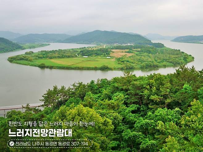 전라남도 나주시 동강면 동강로 307-194에 위치한 ‘느러지 전망관람대’는 나주시 동강면 영산강을 따라 형성된 한반도 지형을 한눈에 조망할 수 있는 명소다.