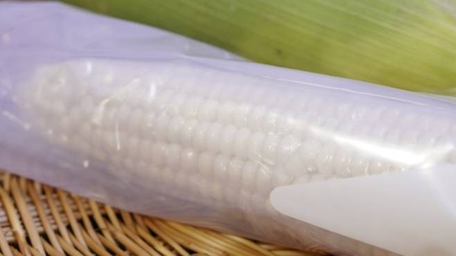 이후 옥수수 겉 부분을 랩으로 꼼꼼히 감싸 주세요. 이렇게 하면 옥수수의 수분이 날아가지 않아 좋아요.