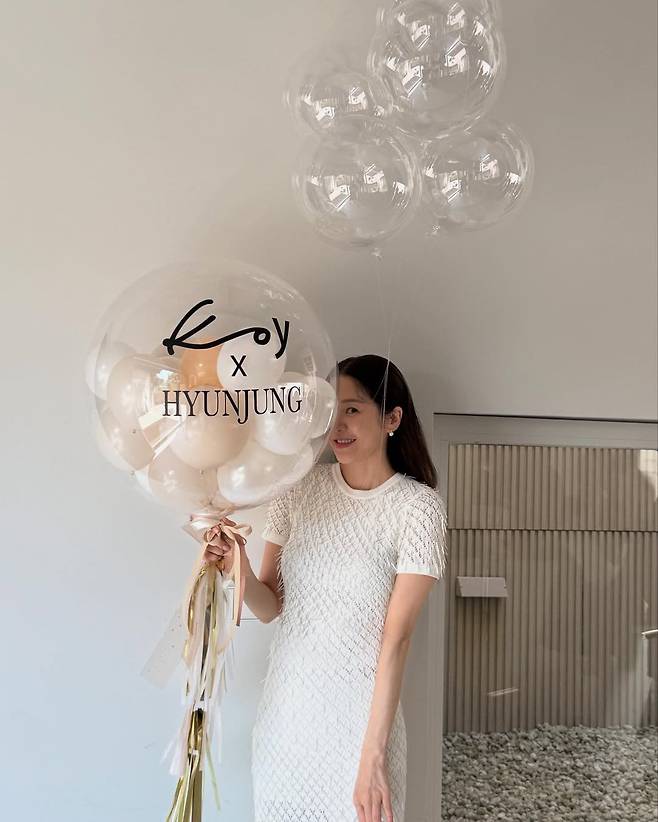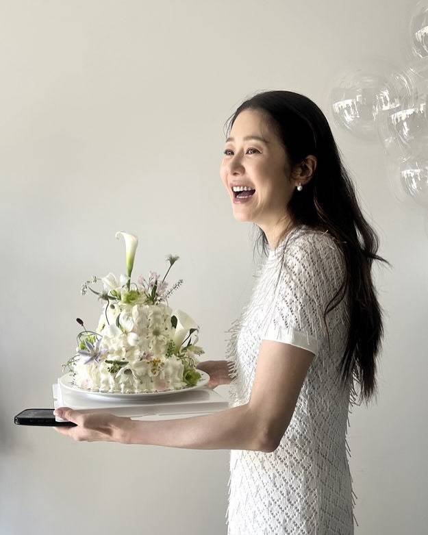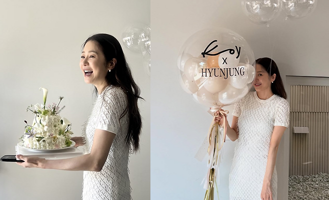 공개된 사진 속 고현정은 순백의 니트 원피스를 입고, 생화 장식이 가득한 3단 케이크와 거대한 투명 풍선을 들고 환하게 웃고 있다.