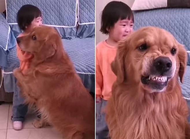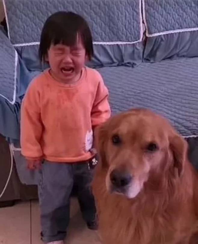 그러자 아이는 놀라고 무서웠는지 울음을 터뜨리고 말았습니다. 그때 마침 아이 옆에 있었던 강아지는 이렇게 반응을 보여 놀라움을 주고 있죠.