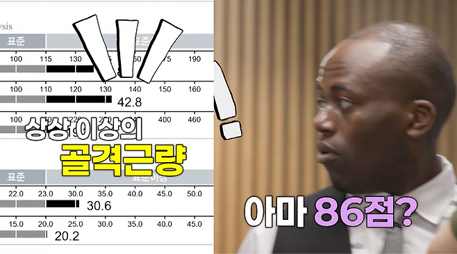 기안84의 체성분 분석 점수는 83점으로 평균 이상을 기록했는데요. 이어 공개된 조나단의 점수는 92점, 골격근량은 무려 42.8kg이었습니다. 조나단의 체성분 분석 결과를 본 출연진들은 놀라움을 금치 못했는데요. 가수 정용화는 "골격근량이 40kg을 넘기기가 쉽지 않다"며 "타고난 근수저로 인정한다"고 말하기도 했습니다.