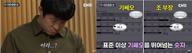 방송인 조나단의 체성분 분석 결과가 공개됐습니다. 최근 방송된 ENA 예능 '기안이쎄오'에서 기안84와 조나단이 체성분 분석기 기업 CEO의 고민 해결을 위해 최사로 출근해 근력 테스트에 이어 체성분 측정을 진행한 것인데요.