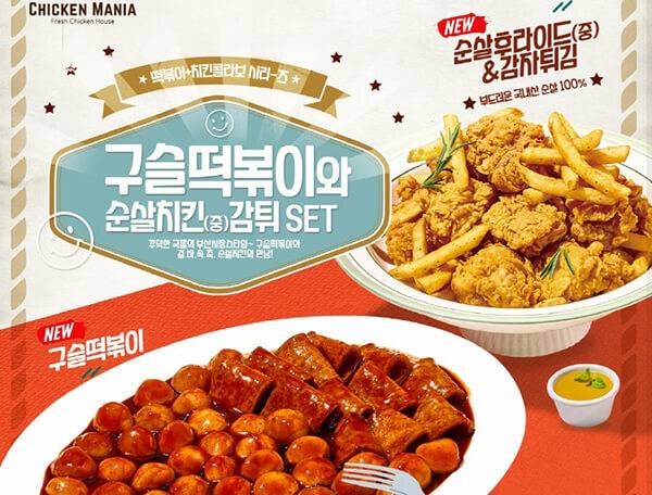 치킨매니아는 떡볶이와 치킨의 콜라보 시리즈로 ‘구슬떡볶이’와 ‘구슬떡볶이치킨세트’를 새롭게 출시했다. 구슬떡볶이는 부산시장 스타일의 꾸덕꾸덕한 소스에 쌀로 만든 구슬떡이 가득 들어간 메뉴며, 구슬떡볶이치킨세트는 구슬떡볶이와 찰떡궁합인 겉은 바삭하고 속은 촉촉한 국내산 100% 프라이드치킨과 감자튀김 구성이다. 구슬떡볶이, 순살치킨(중), 감자튀김 세트의 판매가는 19,900원이다.