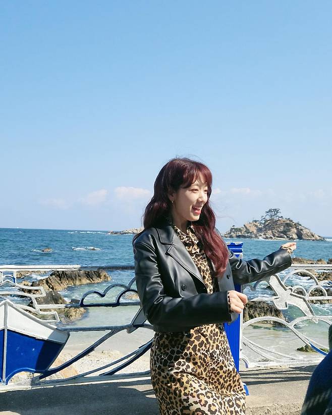레오파드 패턴 원피스와 블랙 가죽 재킷을 매치해 강렬하면서도 우아한 이미지를 선보였다. 패턴의 화려함과 재킷의 시크함이 균형을 이루며, 바닷가 배경과 어우러져 자유로운 분위기를 자아낸다. 이는 과감한 스타일링으로도 조화로운 룩을 완성할 수 있음을 보여준다.