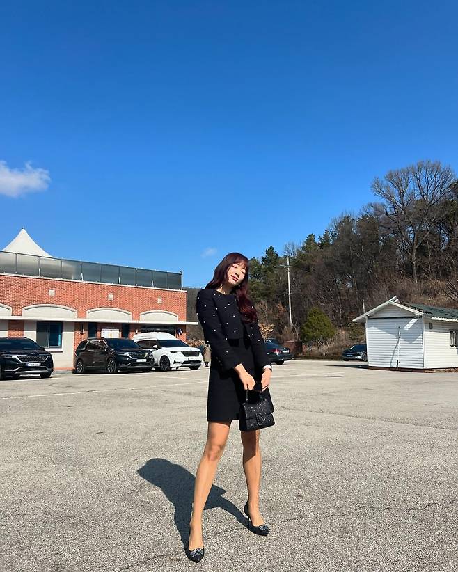 블랙 미니드레스와 크롭 재킷을 매치해 클래식하면서도 세련된 스타일을 선보였다. 드레스에 장식된 진주 디테일이 우아함을 더하며, 작은 핸드백과 플랫 슈즈로 전체적인 룩에 균형감을 주었다. 맑은 하늘 아래에서 더욱 돋보이는 이 스타일은 격식을 갖춘 자리에도 적합하다.