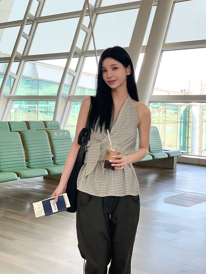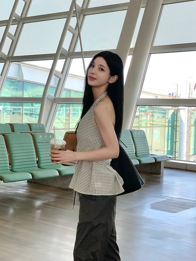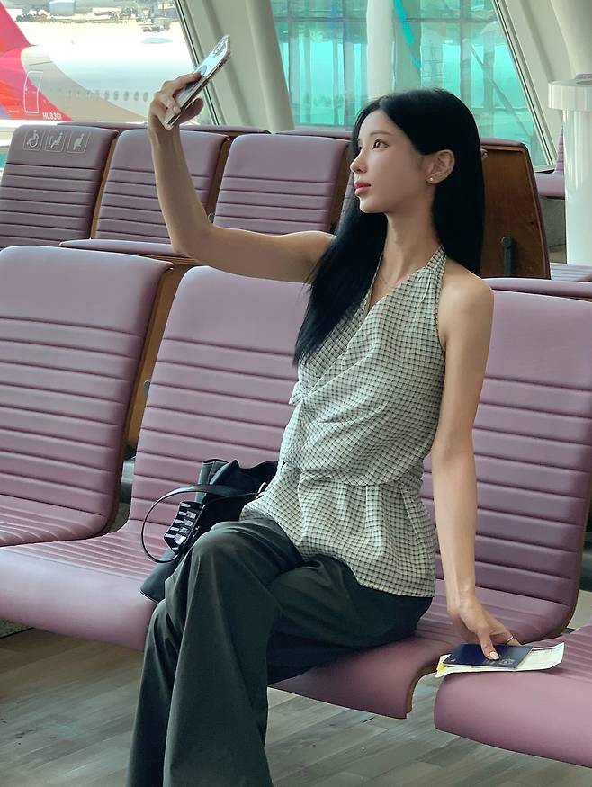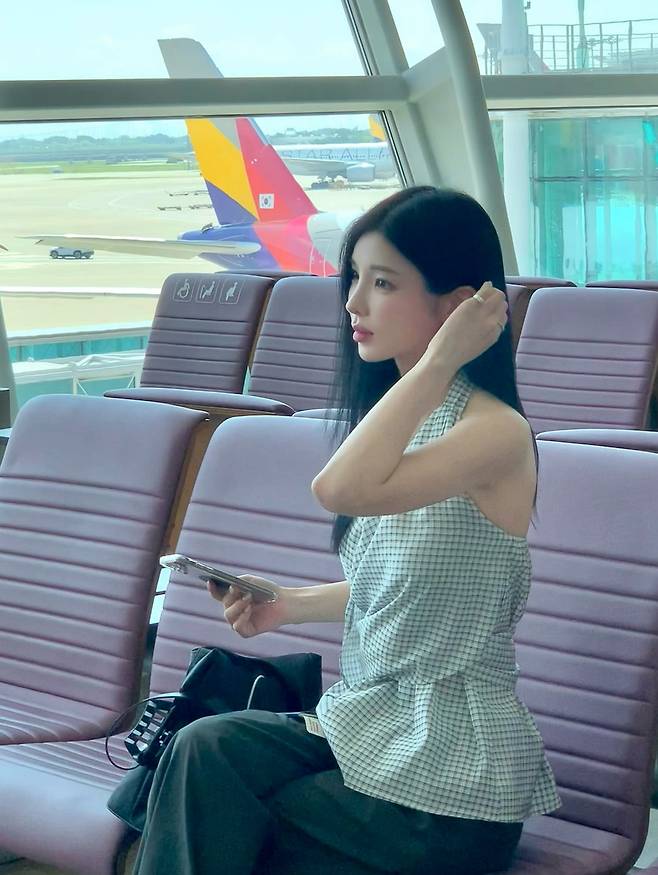 공항 대기석에 앉은 강다은은 단 한 벌의 룩으로 ‘세련된 여유’를 증명했어요.