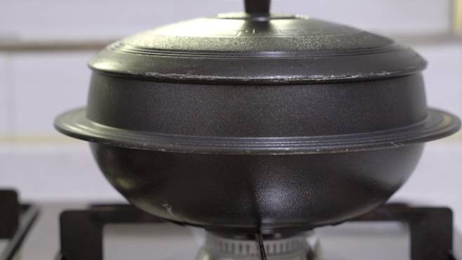 무쇠솥을 달구기 위해 처음에는 강불에서 15초가량 데워 주는 것이 좋아요. 어느 정도 잘 달궈졌다면 약불로 줄여 계속 익혀 주세요. 이때! 반드시 뚜껑을 덮고 익혀 주세요.