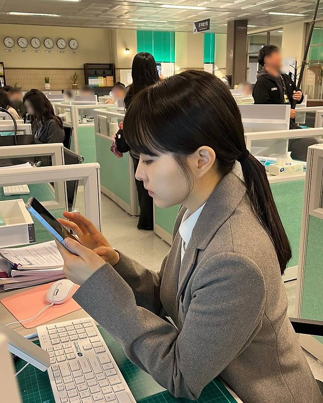 그런데 다음 컷에선 깔끔한 수트 차림으로 집중 모드, 바로 업무 중이에요.