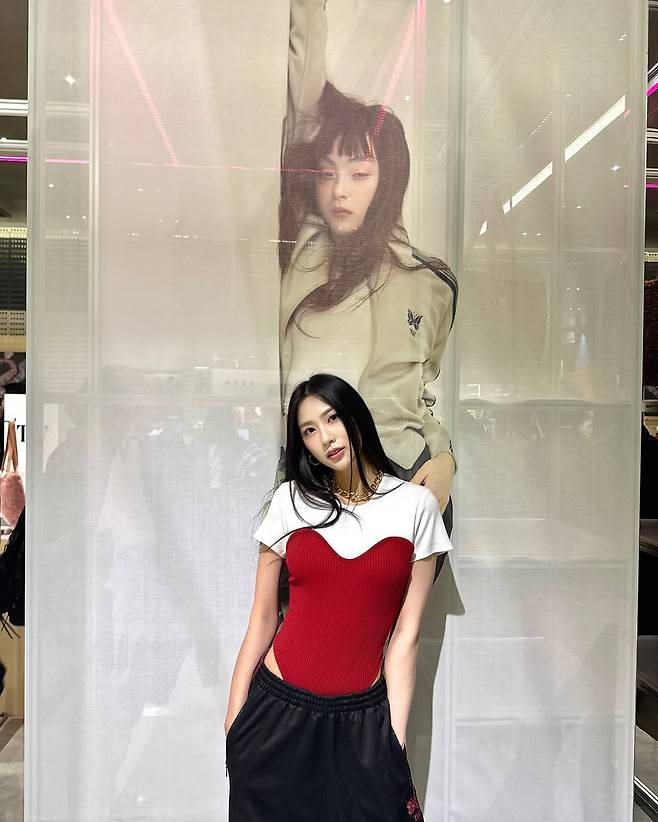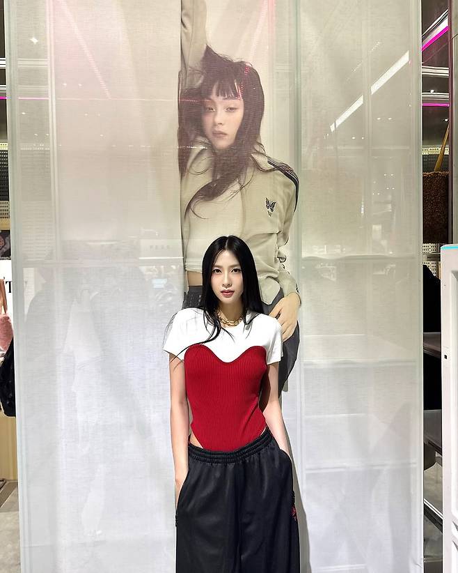 최근 공개된 사진 속 오하영은 감각적인 쇼룸을 배경으로, 유니크한 레이어드 룩을 선보였다. 첫눈에 들어오는 건 하트 셰이프의 레드 코르셋 톱.
