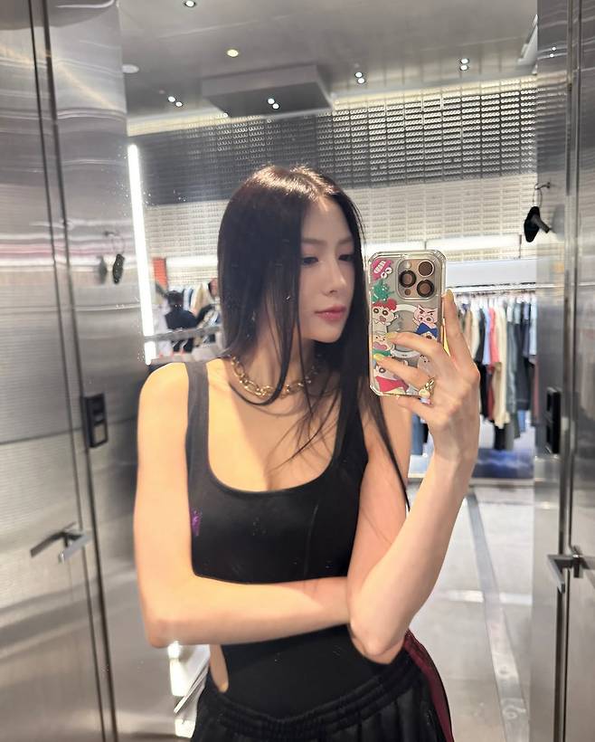 긴 생머리를 자연스럽게 풀어내고, 과감한 컷팅과 매끈한 실루엣이 공존하는 이 룩은 그 자체로 퍼포먼스였다.