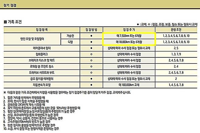 그렇다면 엔진오일의 적정 교환 주기는 어떻게 될까. 엔진오일 교환 주기는 차량의 특성에 따라 차이가 크기 때문에 제조사에서 명시한 매뉴얼에 맞춰 교환하는 것이 일반적인 방법이다. 하지만 주행거리가 길지 않더라도 공회전으로 엔진 가동시간이 길거나 시내 주행이 잦다면 일찍 교환해 줘야 한다.