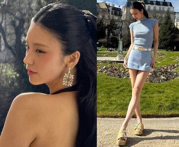 예지는 하늘빛 민소매 니트 탑과 미니스커트의 조합으로 슬림하면서도 세련된 무드를 완성했습니다.