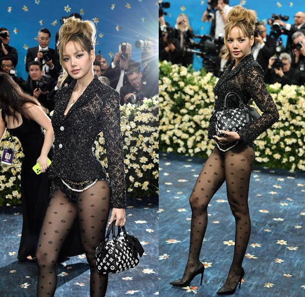 리사는 전신을 감싼 루이비통 시그니처 패턴 시스루 스타킹에 블랙 레이스 테일러드 셋업을 매치하며 눈을 뗄 수 없는 존재감을 과시했습니다.