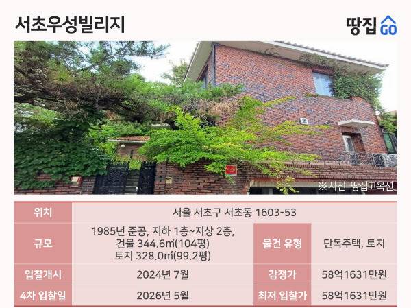 땅집고옥션(▶바로가기)에 따르면 서초구 서초동 1603-53 서초우성빌리지 단지 내 건물면적 344.6㎡(104평), 대지면적 328㎡(약 99평) 단독주택이 오는 5월 7일 4회차 입찰을 진행한다. 감정가는 58억1631만원이며 사건번호는 2024타경114251이다.