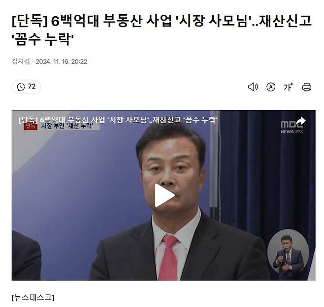 단독) 의왕시장 6백억대 부동산 사업 '시장 사모님'. 재산신고 '꼼수 누락'