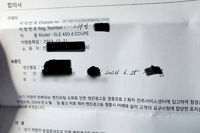 그런데 아니나 다를까 글쓴이는 지난해 9월 11일, 누적 주행 거리 1만 300km쯤에 세 번째로 엔진 경고등이 점등돼 서비스 센터에 맡겼다. 센터 측은 같은 달 19일에 '엔진 오일 소모량은 최대 1천km당 0.8L 이내로 정상 범위'라며 차를 가져갈 것을 안내했으나 글쓴이는 거부했고 현재 대차 차량을 이용 중이라고 밝혔다.