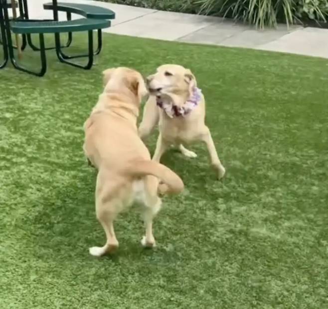 처음에는 다른 노란색 래브라도 마이키를 봐도 반응이 없었다. 하지만 하네스를 벗는 순간 분위기가 완전히 달라졌다.