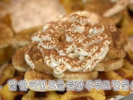 보통 와플이라고 하면 밀가루에 설탕, 버터 같은 재료가 떠오르죠. 그러나 홍윤화 씨는 밀가루 대신 두부 반모, 달걀, 소금, 베이킹파우더, 아몬드 분말로 반죽을 만들어 와플을 완성했어요.