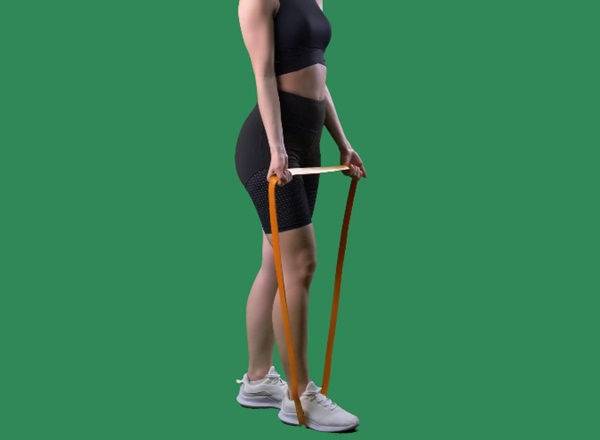 바닥에 서서 한쪽 발을 앞으로 내딛고, 밴드를 발밑에 둡니다. 양손으로 밴드의 끝을 잡고 팔을 옆구리 가까이에 붙입니다. 팔꿈치를 구부리며 밴드를 위로 당겨 손이 가슴 쪽을 향하도록 합니다. 밴드를 원래 위치로 되돌려 시작 자세로 돌아갑니다.