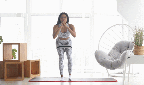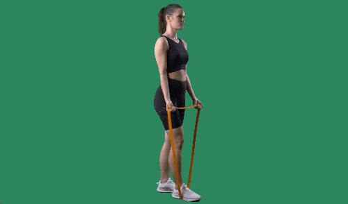 매트 위에 서서 발을 모으고, 허벅지 사이에 탄력 밴드를 착용합니다. 손은 가슴 앞에서 가볍게 깍지 껴 잡아주세요. 무릎을 살짝 구부린 반쯤 앉은 자세를 유지합니다. 오른발을 오른쪽으로 뻗었다가 다시 중앙으로 돌아옵니다. 이어서 왼발로 반복합니다.