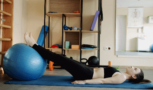 매트에 똑바로 누운 후, 발을 짐볼 위에 올려놓습니다. 엉덩이와 짐볼 사이 거리를 충분히 둬 무릎이 구부러지지 않도록 합니다. 복부에 힘을 주고 엉덩이를 들어 올려 1~2초 유지한 뒤, 엉덩이를 바닥으로 내리며 원래 자세로 돌아옵니다.