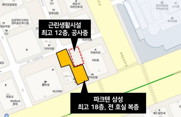 그런데 입주를 앞두고 문제가 생겼다. 파크텐삼성 바로 코앞에 근린생활시설이 들어설 예정이기 때문이다. 강남구청에 따르면 이 근린생활시설은 지하 3층~지상 12층 규모다. 지난해 10월 착공했으며, 현재 터파기 공사가 한창이다. 완공 시점은 2024년 6월이다.