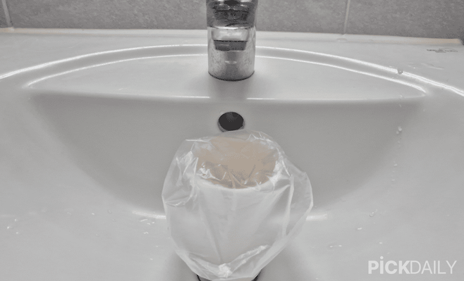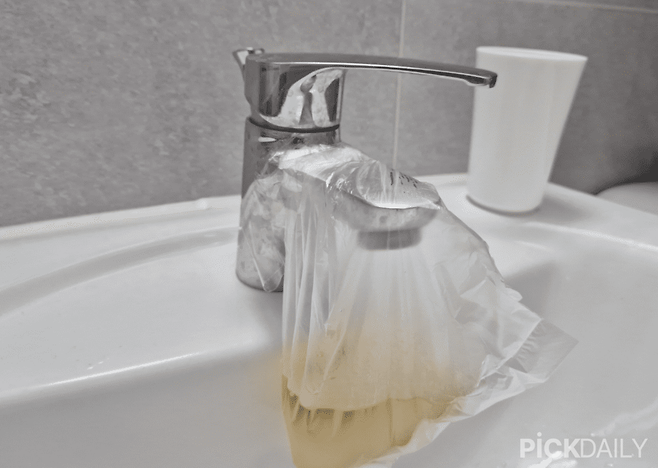 이다음 식초를 넣은 비닐봉지를 수전의 입구에 끼워주고 테이프로 붙이거나 끈으로 묶어 떨어지지 않도록 고정해 주세요.