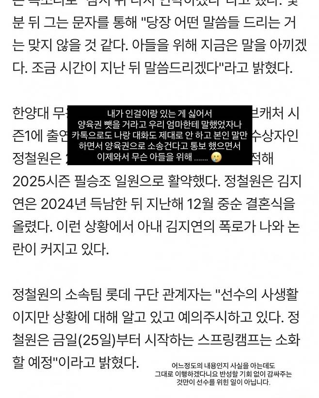 한편 김지연은 정철원과 지난해 12월 결혼식을 올렸으며, 두 사람은 득남 이후 약 1년 4개월 만에 뒤늦게 결혼식을 진행했습니다. 그러나 김지연은 같은 날 오전 자신의 SNS를 통해 이혼을 암시하는 글을 게시하며 부부 간 갈등이 수면 위로 드러났습니다.