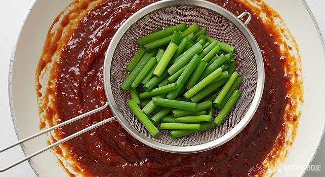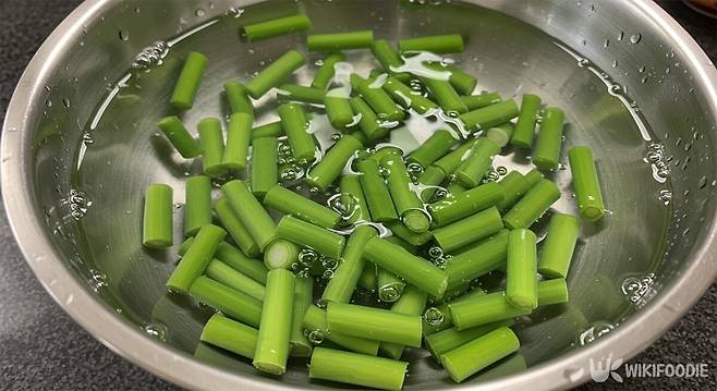 2. 끓는 물에 천일염 1작은술, 소주 2큰술을 넣고 마늘쫑을 30초간 데친다.