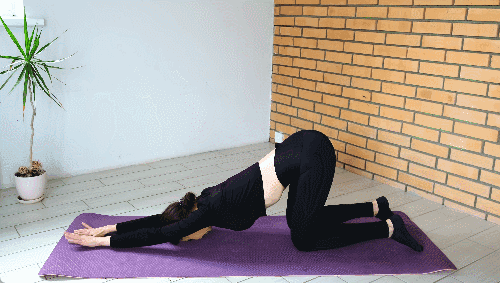 네발기기 자세로 바닥에 엎드립니다. 상체를 바닥으로 천천히 낮추며 팔을 뻗어 스트레칭합니다. 엉덩이는 무릎 위에 위치하도록 자세를 맞춥니다. 호흡을 유지하세요.