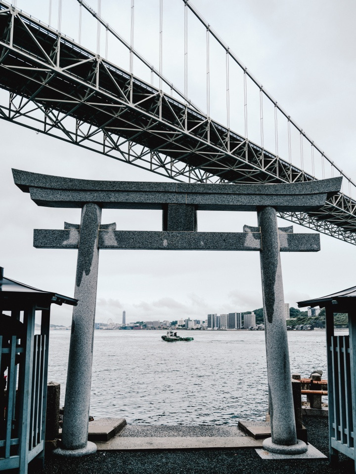 규슈와 혼슈를 잇는 간몬대교(関門橋) 바로 아래 자리한 메카리 신사는 간몬해협을 향해 도리이(일본 신사의 경내로 들어가는 입구를 나타내는 관문)를 세웠다. 신사 앞에 서서 바라보면, 해협 건너편 시모노세키가 도리이의 기둥 사이에 절묘하게 들어온다. 해외에서 온 방문객들은 이 구도를 종종 사진에 담는다. 신사의 유래가 서기 200년 전후로 거슬러 올라간다고 하니 꽤 역사가 깊다. 항구 마을의 신사인지라 현지인은 대대손손 이곳에서 바다에서의 안전을 기원했단다. 음력 설날의 이른 아침에 신관들이 바다에서 미역을 베어와 신사에 바치는 메카리제(和布刈祭)도 기타큐슈의 중요한 연례행사다. 미니멀한 외관의 신사 부속 건물에서는 구매욕을 자극하는 세련된 디자인의 수여품(授与品, 일본 신사에서 판매하는 종교 관련 물품과 부적)을 전시 판매한다.