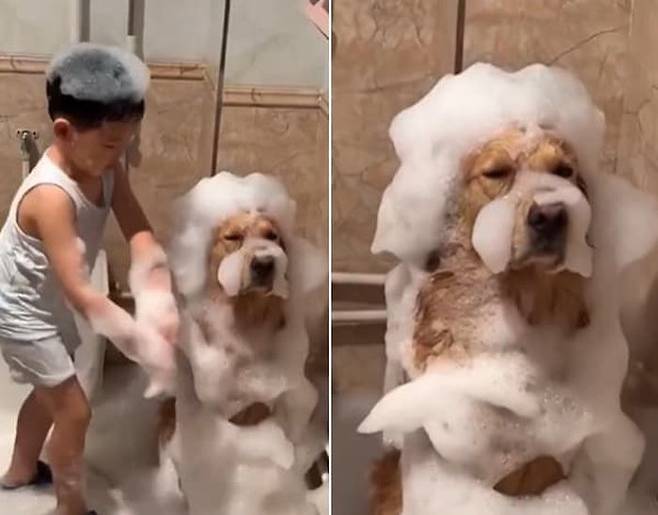 공개된 영상 속에서 아이는 신이 나서 강아지에게 물을 뿌리고 샴푸 거품을 열심히 묻혀줍니다.