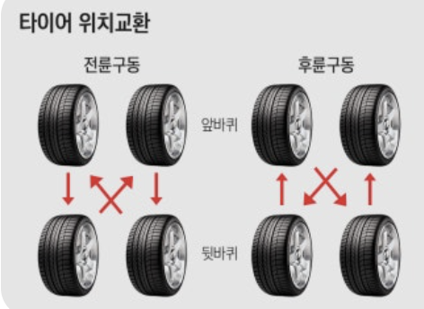 전륜구동 (대부분의 차): 앞 타이어는 그대로 뒤로 보내고, 뒷 타이어는 대각선으로 교차시켜 앞으로 보냅니다. (X자 교차)