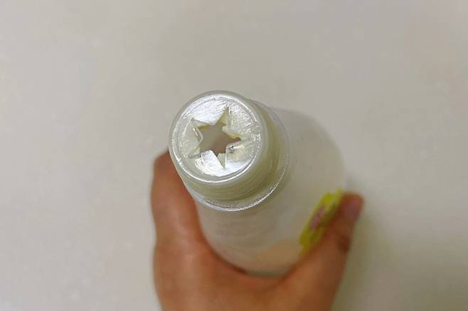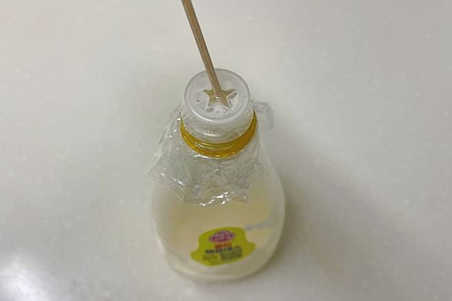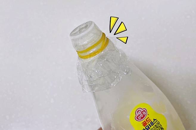 비닐랩을 적당히 뜯어 마요네즈통 입구를 감아준 뒤 노란 고무줄로 고정시켜 주세요.