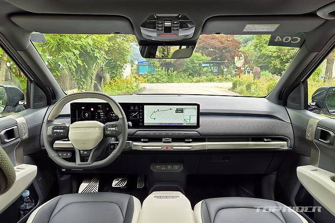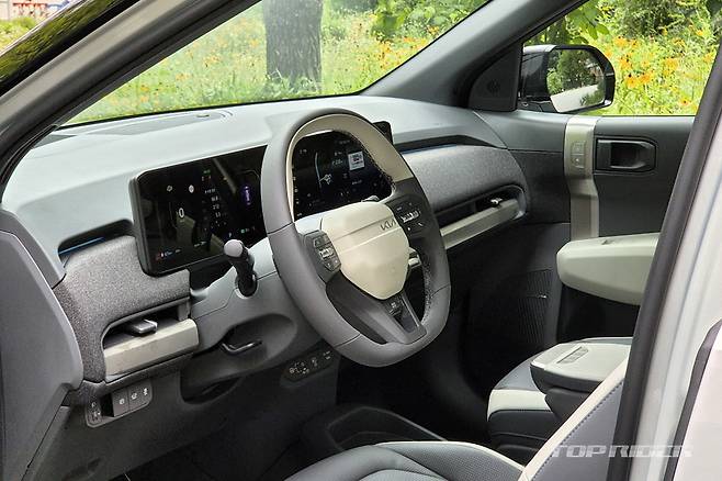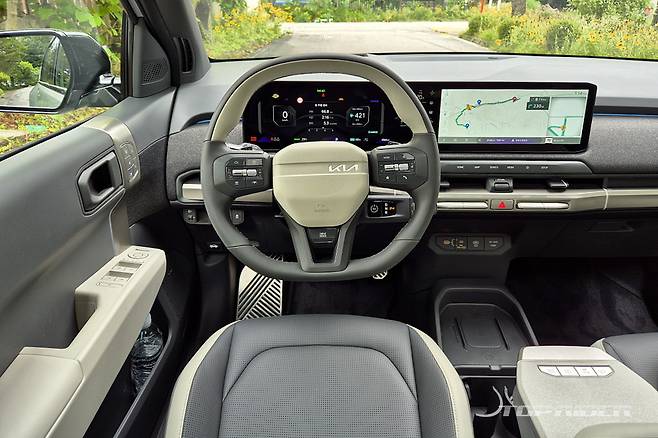 실내 공간은 기아 셀토스에 가깝다. EV3는 전장 4310mm(-80), 전폭 1850mm(+50), 전고 1570mm(-50), 휠베이스 2680mm(+50)로 셀토스와 비교시 짧지만 넓고 와이드한 프로포션이다. 전기차 전용 설계로 바닥면에 높은 느낌은 거의 없고, 대시보드 위치가 적절하다.