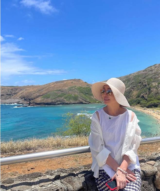 챙이 넓은 햇과 미러 선글라스를 착용해 휴양지 분위기를 살리면서도 피부 보호와 스타일을 동시에 챙겼습니다.