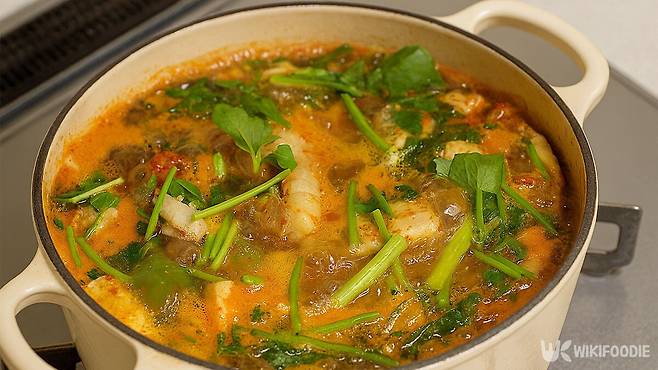 중불에서 대파, 고추, 두부를 넣고 5분 정도 더 끓여 맛이 어우러지게 한다. 향긋한 미나리는 불을 끄기 직전에 넣어야 질겨지지 않고 아삭한 식감이 산다.