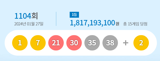 제1104회 로또 1등 당첨번호로 '1, 7, 21, 30, 35, 38'이 뽑혔다.