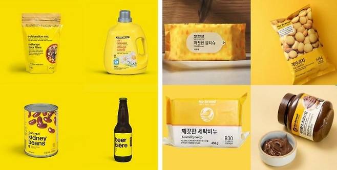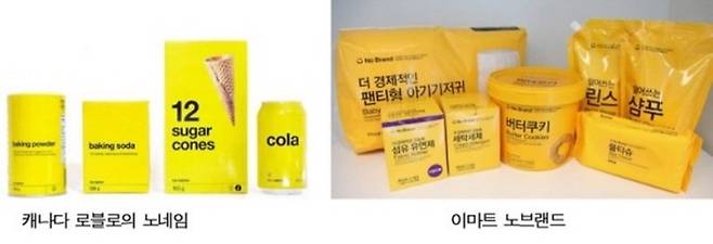 노네임은 캐나다 1위 유통업체 '로블로'가 1978년도에 출시한 브랜드인데, 소비자들이 기존가보다 10~40% 저렴하게 상품을 소비할 수 있도록 한 컨셉트까지 비슷해요. 메인 컬러도 노랑인데 이걸 바꾸는 노력도 안했어요.