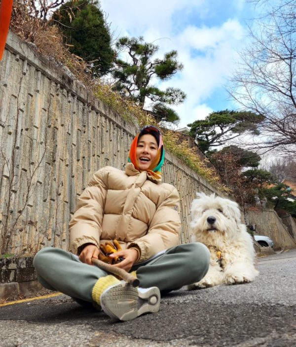 강아지와 산책을 즐기고 여유로운