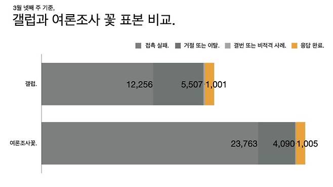 갤럽과 비교하면 갤럽이 콜백을 더 많이 하고 갤럽도 저녁 조사를 하지만 주말 조사는 하지 않는 경우가 많았다. 접촉 실패 건수는 여론조사꽃이 더 많고 거절 또는 이탈은 갤럽이 더 많다. (역시 콜백이 많아서 일단 받고 끊기 때문일 수도 있다.) 전국 단위 조사의 경우 갤럽은 사흘 동안 하는데 여론조사꽃은 이틀에 끝낸다는 것도 차이다. 전화를 안 받으면 콜백을 하기 보다는 다른 번호로 시도하고 그래서 접촉 실패가 더 많을 가능성이 크다.