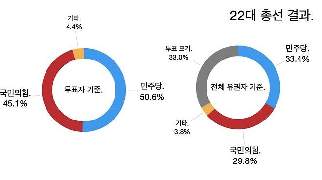 전체 유권자 기준으로 보면 33%가 투표를 하지 않았고 민주당과 국민의힘의 유권자 수 대비 득표율은 각각 33%와 30%에 그쳤다. 무당층과 투표 불참자를 감안하면 실제로 최종 결과는 여론조사꽃보다는 갤럽이 좀 더 가깝다고 할 수 있다.