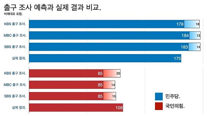 출구 조사 예측과 결과가 다른 지역구가 18군데나 됐다.