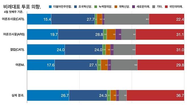 2월 말까지 민주당이 크게 뒤처졌다는 게 주요 여론조사 업체들 지배적인 관측이었고 이를 근거로 한겨레도 국민의힘이 제1당이 될 것이라고 전망했다.